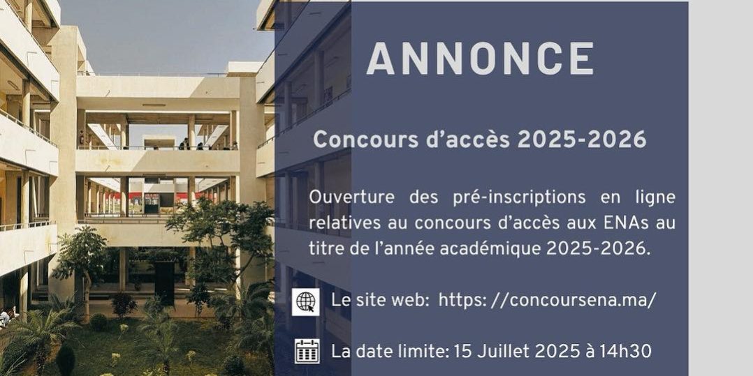 Jun192025Actualités et événements Ouverture des pré-inscriptions en ligne relatives au concours d’accès aux ENAs au titre de l’année académique 2025-2026 sur le site Web.Le site web : https://concoursena.maLa date limite : 15 Juillet 2025 à 14h30 Category: Actualités et événementsBy Enaagadir19 June 2025Leave a comment Author: Enaagadir Post navigationPreviousPrevious post:Enseignement hors les murs – ENA AgadirNextNext post:Enseignement & OuvertureRelated PostsOctobre urbain Rencontres Scientifiques de l’ENA AGADIR Deuxième édition30 October 2025Des villes intelligentes centrées sur l’humain | Octobre urbain | ENAA27 October 2025Journée mondiale de la statistique 202524 October 2025Assises de l’architecture de l’ENAA – Monsieur Mohammed El Habib Begdouri Achkari23 October 2025CONFÉRENCE – La formation de l’architecte au Maroc : opportunités et perspectives9 October 2025Rentrée académique 2025-2026 | 9ème Promotion de l’ENA Agadir6 October 2025