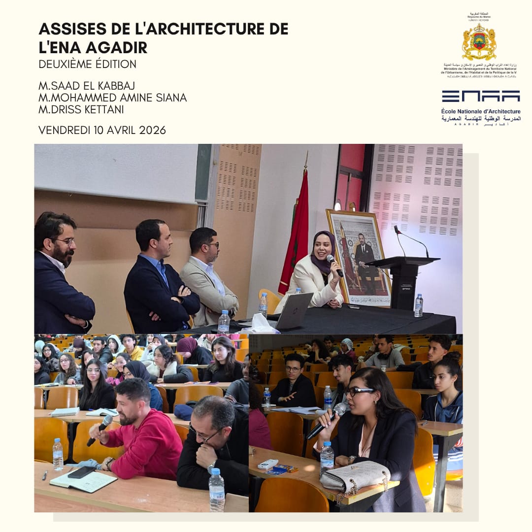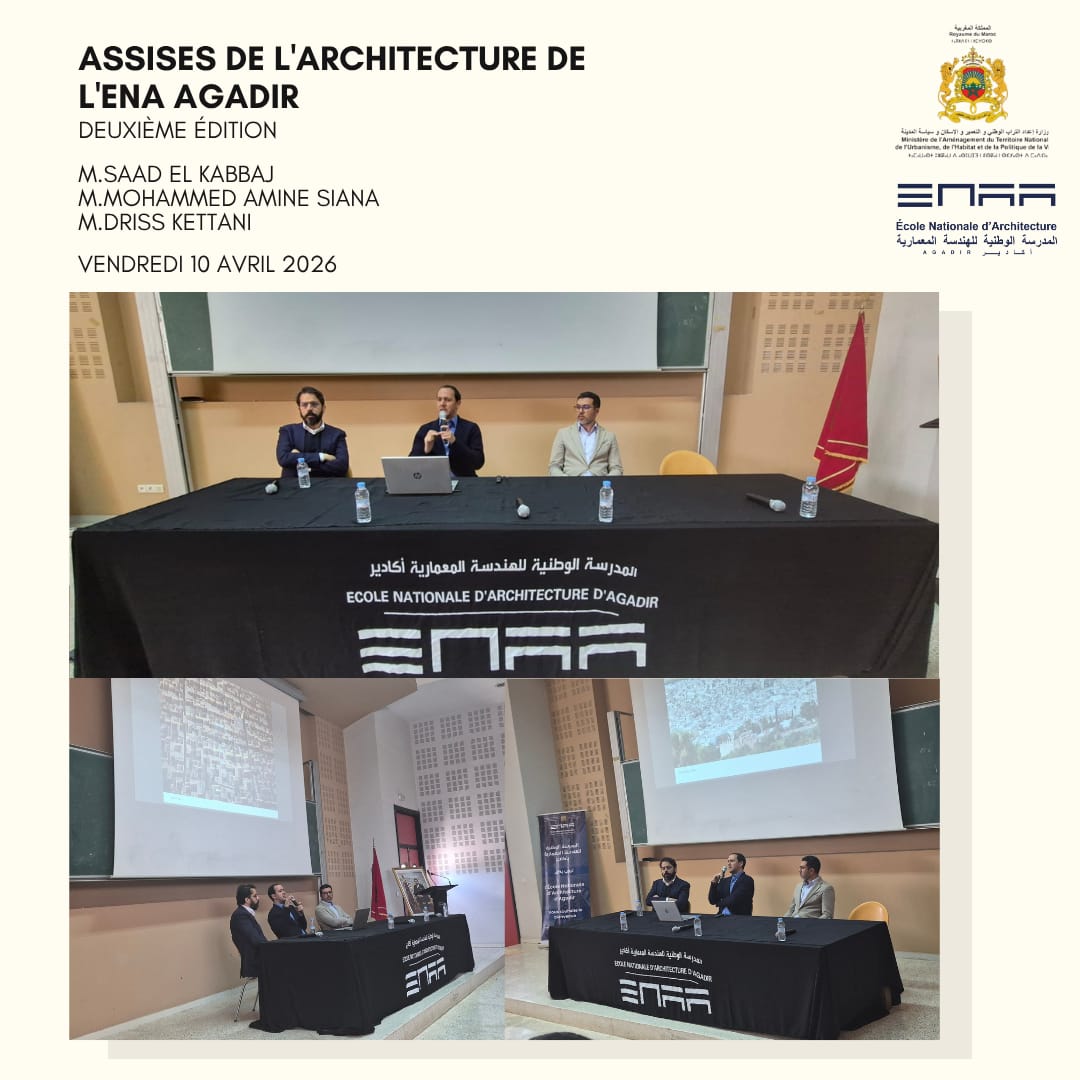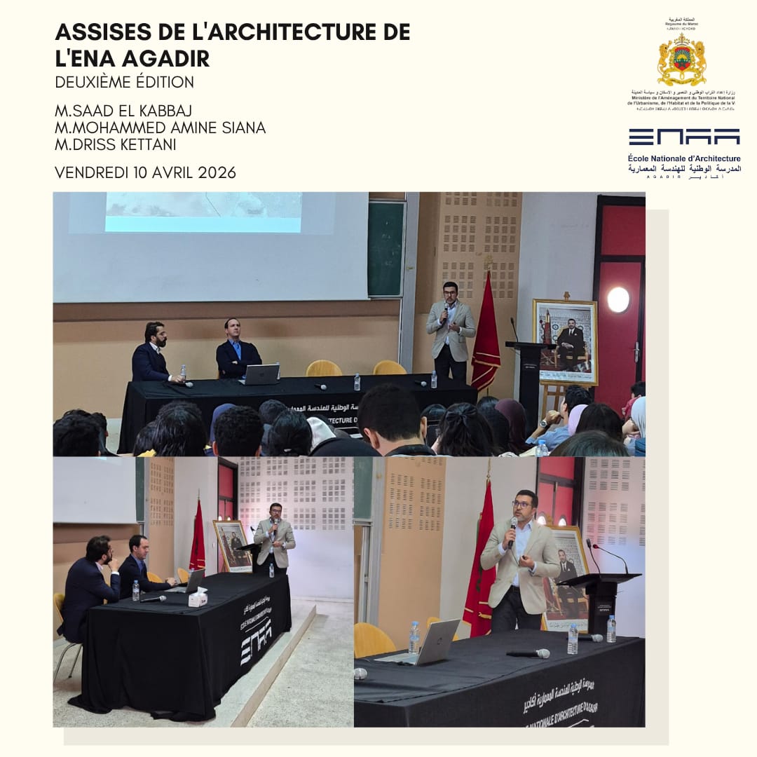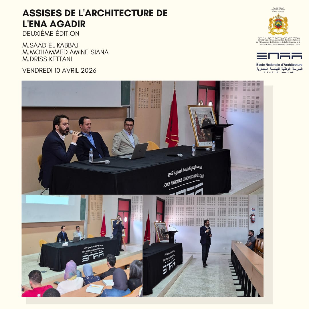 Retour en images sur la conférence tenue vendredi 10 Avril 2026, sous le thème “Contexte & Modernité”, en présence de Madame Imane BENTAHILA, directrice de l’ENA Agadir, des enseignants, étudiants et équipes de l’école. Pour ce nouveau rendez-vous, l’ENA d’Agadir a eu le plaisir d’accueillir trois figures majeures de la scène architecturale contemporaine au Maroc : Saad EL KABBAJ, Mohamed Amine SIANA et Driss KETTANI.