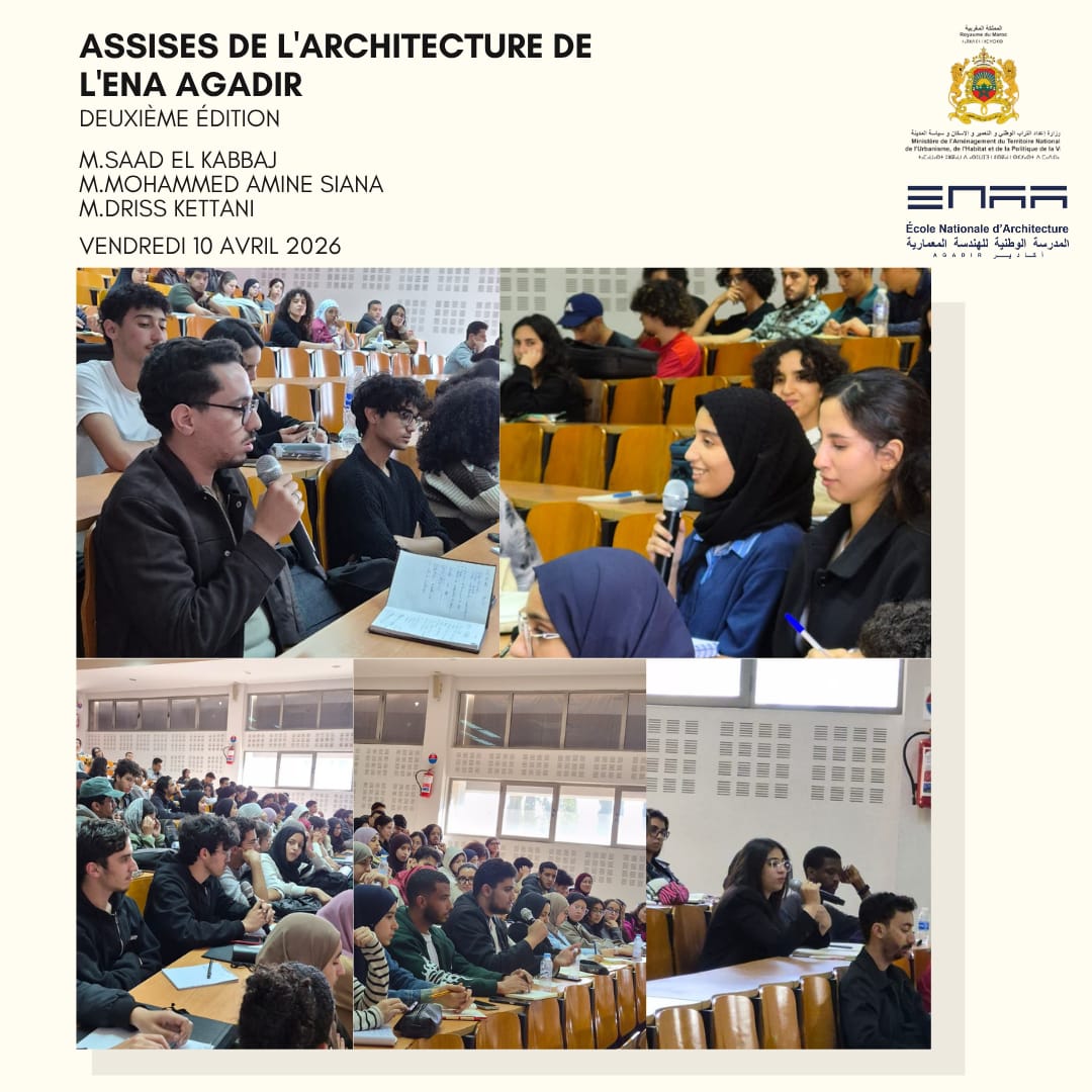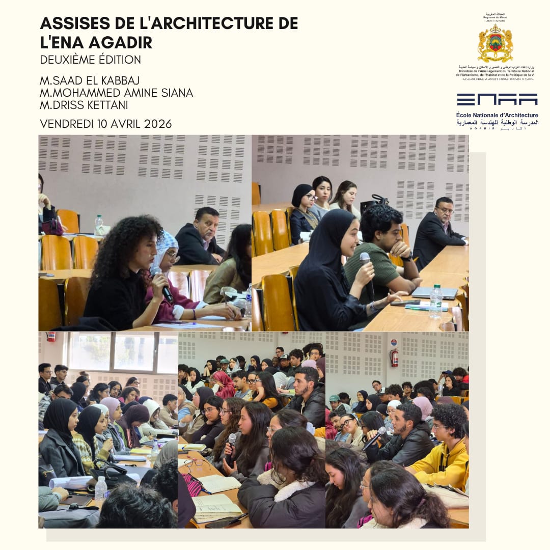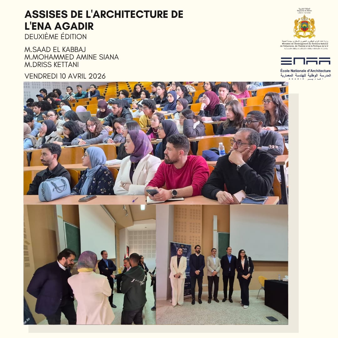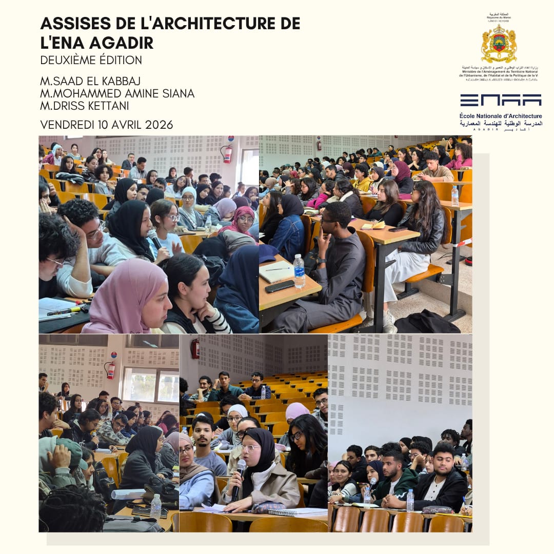 Retour en images sur la conférence tenue vendredi 10 Avril 2026, sous le thème “Contexte & Modernité”, en présence de Madame Imane BENTAHILA, directrice de l’ENA Agadir, des enseignants, étudiants et équipes de l’école. Pour ce nouveau rendez-vous, l’ENA d’Agadir a eu le plaisir d’accueillir trois figures majeures de la scène architecturale contemporaine au Maroc : Saad EL KABBAJ, Mohamed Amine SIANA et Driss KETTANI.