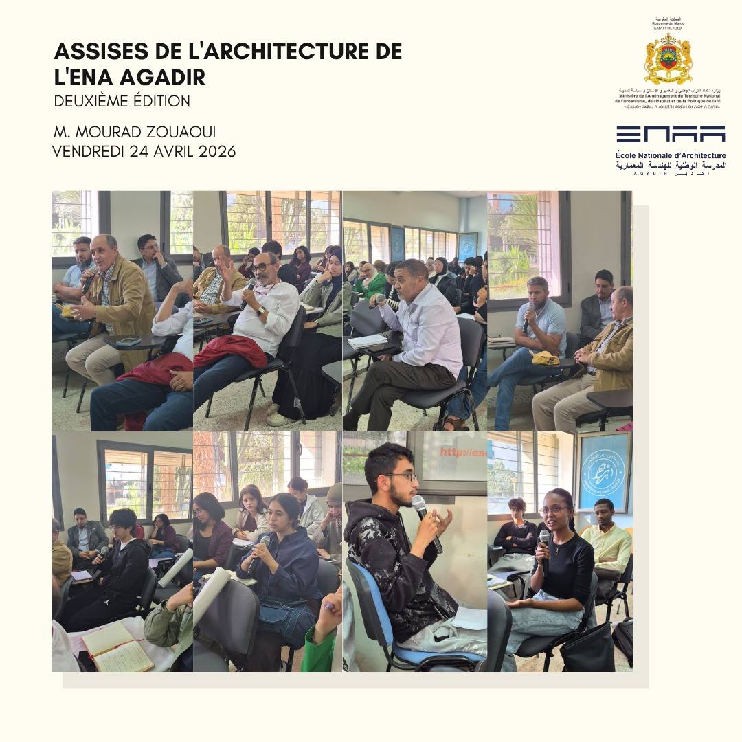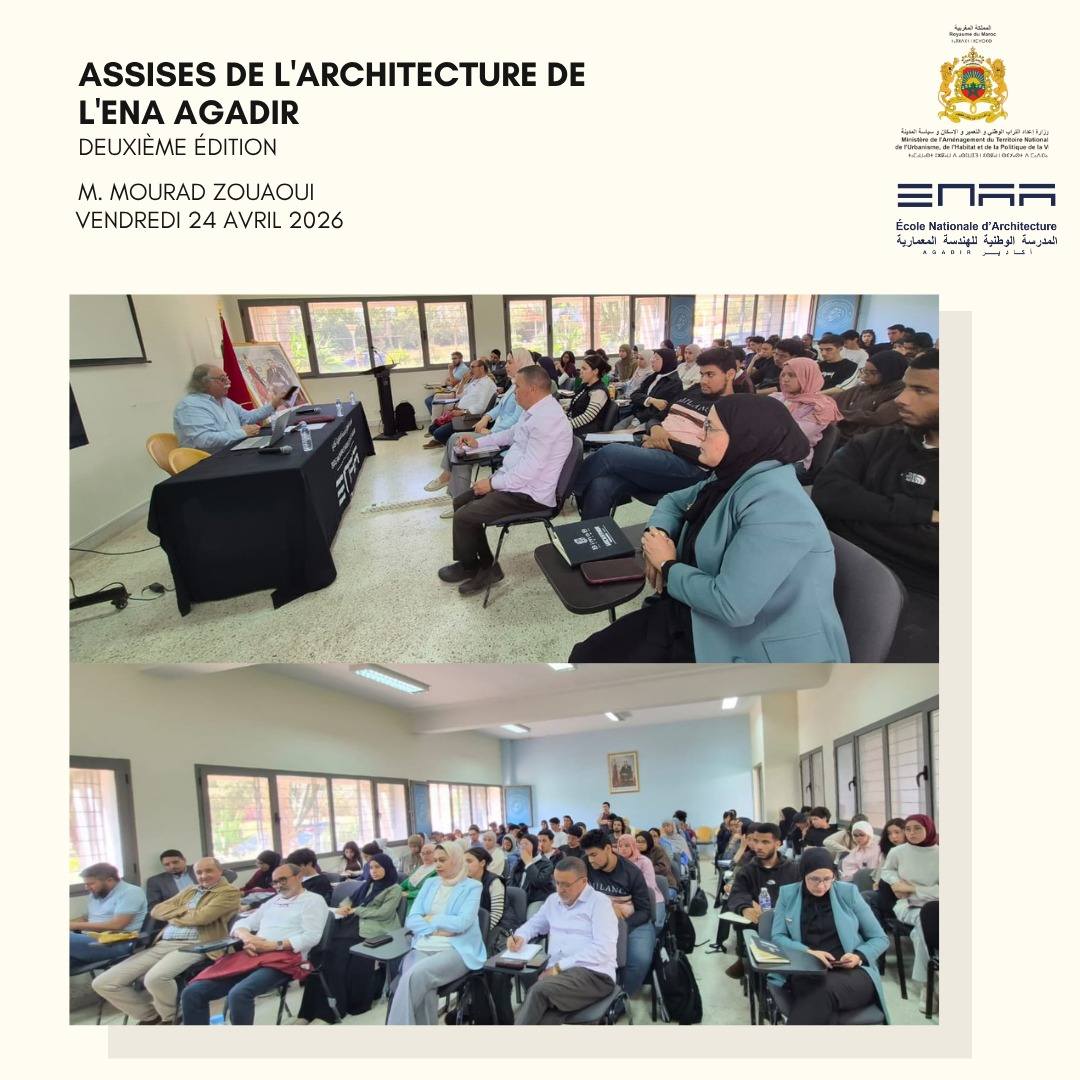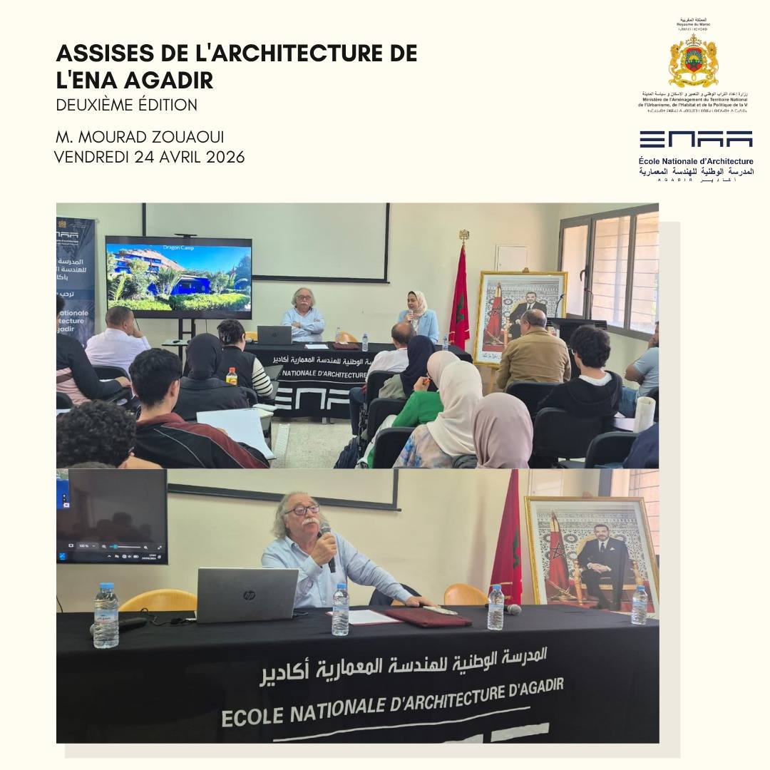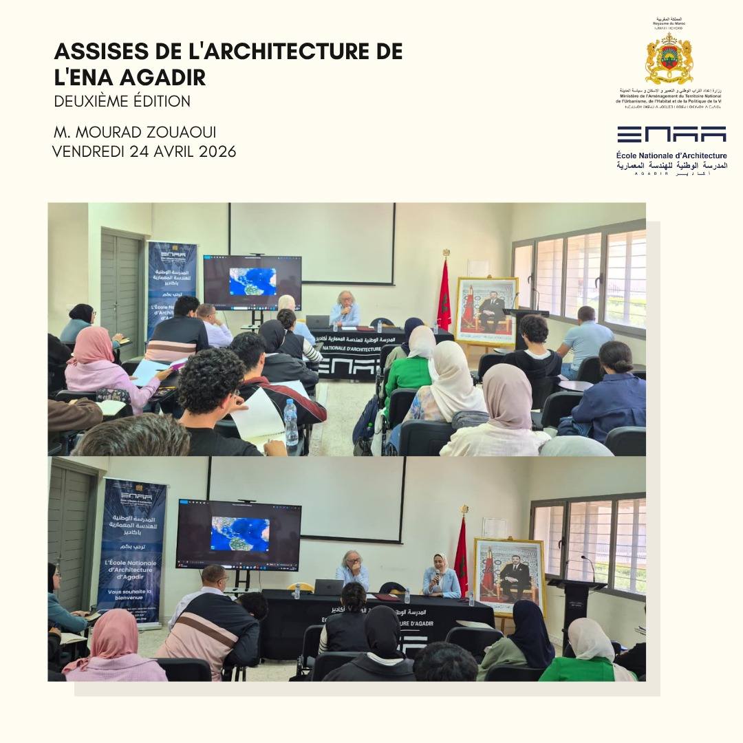 Retour en images sur les moments forts de la conférence animée par Monsieur Mourad ZOUAOUI, qui a eu lieu le Vendredi 24 Avril 2026 à l’Ecole Nationale d’Architecture d’Agadir, en présence de Madame Imane BENTAHILA, directrice de l’ENA Agadir, les enseignants et étudiants de l’école, sous le thème : « Dakhla-Lagon, un modèle de développement durable au service d’un spot mondial ».